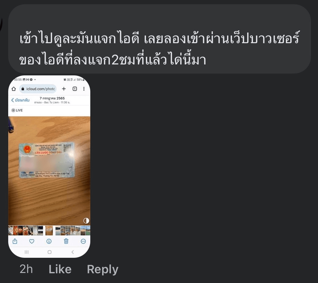 เมื่อเหยื่อไม่สามารถนำเครื่องโทรศัพท์ออกจากระบบจากไอดีของเหยื่อได้แล้ว เหยื่อก็จะปล่อยค้างไว้ และยิ่งค้างไว้นานเท่าไหร่ ข้อมูลก็จะถูกอัปโหลดขึ้นไปมากเท่านั้น (กรณีเหยื่อล็อกอินผ่าน iCloud โดยตรง) และอาจมีข้อมูลสำคัญ เช่น บัตรประชาชน หรือเอกสารต่าง ๆ ที่ถ่ายรูปไว้ โดยในกรณีนี้ มีผู้อาสา ทดลองเข้าแอปเปิ้ลไอดี ในเครื่องอื่น ๆ เพื่อเข้าไปตรวจสอบแล้ว พบว่า มีรูปต่าง ๆ ถูกอัปโหลดขึ้นบน iCloud จริง และมาจากต่างอุปกรณ์ (คาดว่ามีเหยื่อจำนวนมากที่หลงล็อกอินเข้าไป) ดังภาพด้านล่างนี้