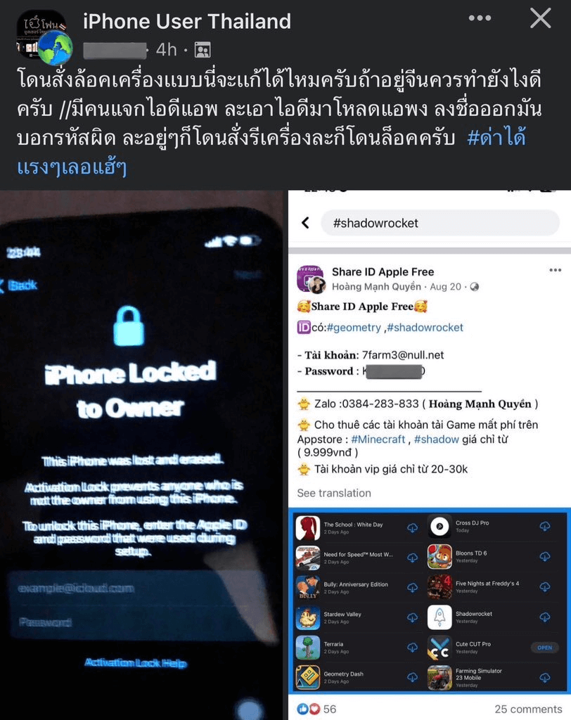 โดยมิจฉาชีพจะโพสต์ลงตามกลุ่มต่าง ๆ ในหลากหลายรูปแบบ ไม่ว่าจะเป็นการแจกแอปเปิ้ลไอดี (AppleID) ให้ฟรี โดยหลอกล่อว่ามีแอป, เกมเสียเงินอยู่ด้านใน เพื่อให้เหยื่อทำการเข้าสู่ระบบ หรือล็อกอินไอดีของมิจฉาชีพเข้าไปในเครื่องเพื่อโหลดแอปฯ หลังจากนั้นไม่นาน มิจฉาชีพก็จะทำการเปลี่ยนรหัสในภายหลัง เพื่อให้เหยื่อไม่สามารถออกจากระบบจากไอดีของมิจฉาชีพได้ เนื่องจากเป็นมาตรการความปลอดภัยจาก Apple ที่บังคับให้ผู้ใช้งานทุกคนต้อง กรอกรหัสผ่านที่ถูกต้อง เพื่อออกจากระบบ หลังจากนั้น มิจฉาชีพก็จะทำการสร้างความเสียหายในลำดับถัดไป