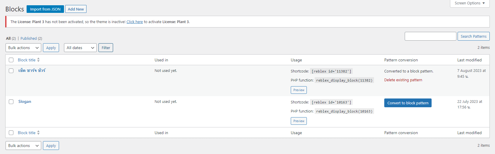 นี่แหละ เข้าท่า จึงได้ค้นหาอยู่นานว่าเราจะแปลงไอ้เจ้า Reuseable Blocks / Pattern นี้ไปเป็น Shortcode แล้วเรียกมันได้ยังไง จึงได้พบปลั๊กอิน Reusable Blocks Extended นี้เข้า ซึ่งดูเหมือนว่ามันจะจัดการให้ได้ทั้งหมดที่ว่ามา ด้วยการมี ส่วนแยกที่จะแสดง Blocks ที่เคยสร้างไว้ แถมยังเข้าไปแก้ไขได้ด้วย แล้วยังแปลงไปเป็น Pattern พร้อมกับสร้าง Shortcode ได้ในเวลาอันสั้น